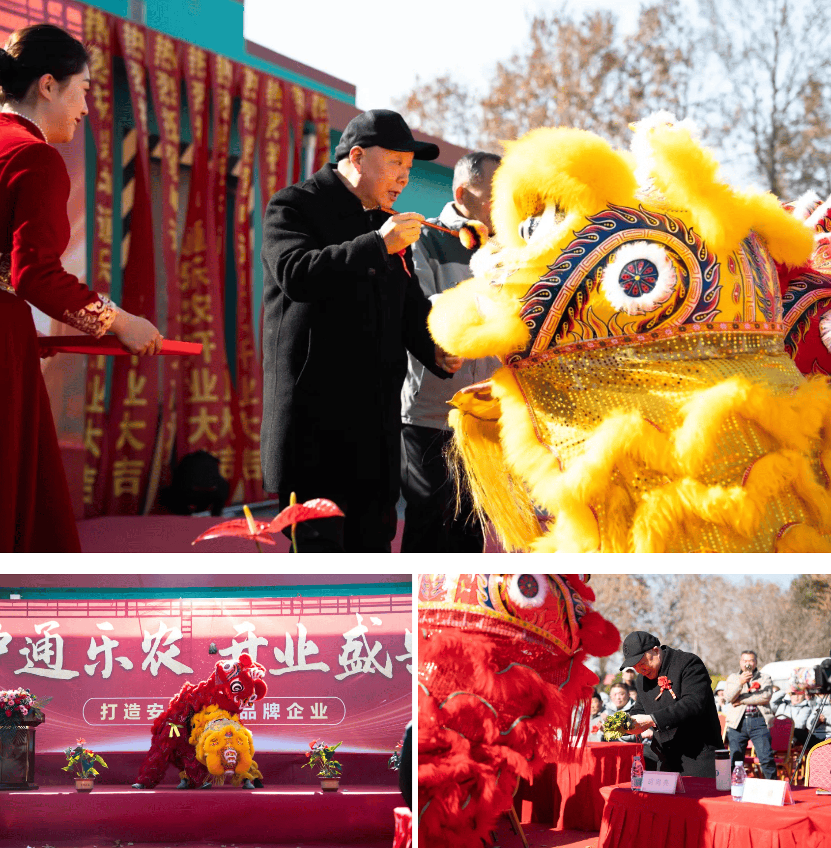 伴随着喜庆的音乐,两头栩栩如生的雄狮登台,附子先生和陶沛江共同为醒狮点睛。紧接着,雄狮进行舞动表演和采青仪式,为此次开业助兴,并送上“开业大吉”美好祝愿。